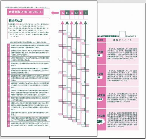 ご記入いただいた回答の合計点数に基にした「運転アドバイス」とA~Fの項目別の点数に基づいた「交通違反タイプ別アドバイス」をご確認いただくことができます。